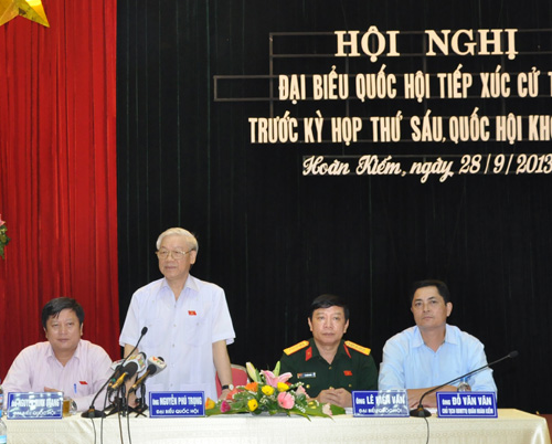 Trao đổi với cử tri về việc lấy phiếu tín nhiệm tại Quốc hội và Hội đồng nhân dân, Tổng Bí thư Nguyễn Phú Trọng đánh giá đây là một bước tiến quan trọng trong hoạt động của cơ quan dân cử và cũng là thực hiện Nghị quyết Trung ương 4 (khóa 11) về xây dựng Đảng. Quốc hội sẽ tiếp tục lắng nghe ý kiến của các tầng lớp nhân dân và cử tri để làm tốt hơn nữa việc này. Đối với tình hình phát triển kinh tế- xã hội đất nước, Tổng Bí thư cho biết: Chính phủ đang chuẩn bị báo cáo Trung ương và Quốc hội tình hình kinh tế- xã hội năm 2013, dự kiến năm 2014 và đồng thời nhìn lại gần 3 năm thực hiện Nghị quyết Đại hội 11 về kinh tế xã hội.