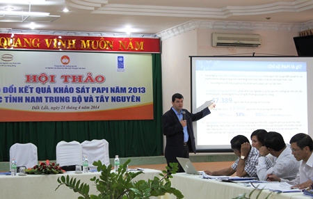 | Ông Jairo Acuna Alfaro - Cố vấn chính sách, Trưởng nhóm nghiên cứu Chương trình Phát triển Liên hợp quốc tại Việt Nam trình bày báo cáo xu thế biến đổi chỉ số PAPI ở Việt Nam giai đoạn 2011-2013. |