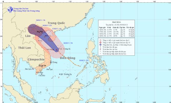 (VOV5) - Trung tâm Khí tượng Thủy văn quốc gia cho biết: Hồi 19 giờ ngày 6/8, vị trí tâm bão số 6 ở vào khoảng 15,9 độ Vĩ Bắc; 111,0 độ Kinh Đông, trên khu vực phía Tây Nam quần đảo Hoàng Sa, cách bờ biển các tỉnh Thừa Thiên Huế - Quảng Ngãi khoảng 250km về phía Đông Đông Bắc.
