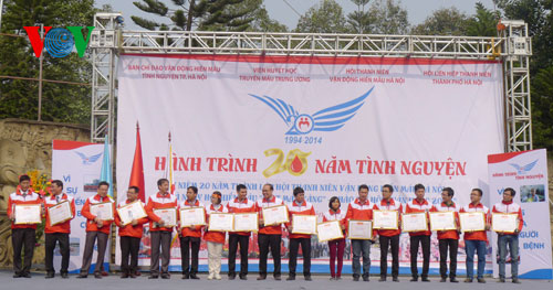 Ngày 18/1, tại Hà Nội, Hội Thanh niên vận động hiến máu Hà Nội phối hợp với Viện Huyết học truyền máu Trung ương tổ chức chương trình “Hành trình 20 năm tình nguyện", kỷ niệm 20 năm thành lập Hội Thanh niên vận động hiến máu Hà Nội (24/01/1994- 24/01/2014) và Ngày Hội hiến máu “Giọt máu vàng”.