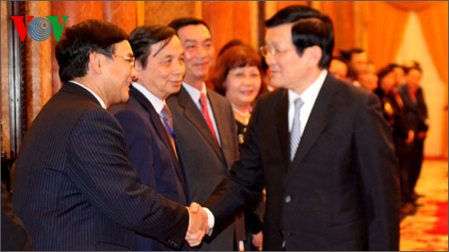 | Chủ tịch nước Trương Tấn Sang chúc mừng các đại sứ. |