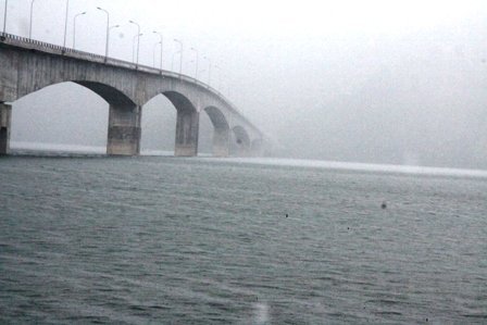 | Cầu Pá Uôn chìm trong cơn mưa bất chợt. |