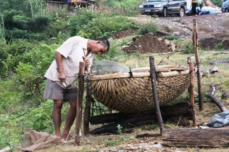 | Người đàn ông này đang miệt mài hoàn thành nốt chiếc thuyền tre do tự tay mình làm. Đây sẽ là “cần câu cơm” của anh trong thời gian tới, để đánh bắt tôm, cá tự nhiên trong lòng hồ. |