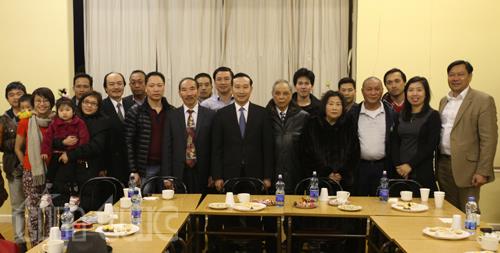 | Đại sứ Nguyễn Văn Thảo (giữa) chụp ảnh lưu niệm với cộng đồng người Việt tại Ireland. - Ảnh: Lê Phương/TTXVVN |