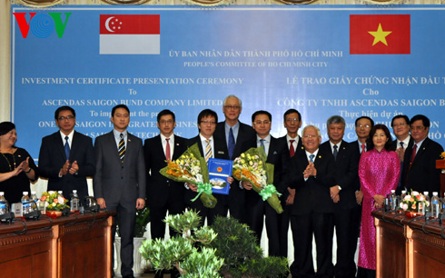 (VOV5)- Nguyên Thủ tướng Gok Chok Tong dự Lễ trao giấy chứng nhận đầu tư cho liên danh Công ty trách nhiệm hữu hạn Ascendas Land Việt Nam và Công ty trách nhiệm hữu hạn Saigon Bund Capita Partner.