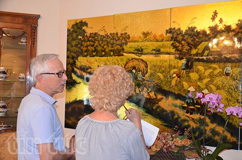 | Du khách trầm trồ trước bức tranh đồng quê treo tại phòng khách của “Nhà Việt Nam”. Ảnh: Lê Hoàng |