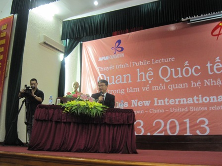 (VOV5) - Sáng 19/3, tại Hà Nội, Trung tâm giao lưu văn hóa Nhật Bản tại Việt Nam phối hợp với Đại học Quốc gia Hà Nội tổ chức buổi thuyết trình với chủ đề “ Quan hệ Quốc tế mới của Nhật Bản: Mối quan hệ Nhật-Trung-Mỹ và khu vực Đông Nam Á”. Tại buổi thuyết trình, tiến sĩ Yasushi-Watanabe, hai diễn giả nổi tiếng đến từ trường đại học Waseda và đại học Keio, trình bày quan điểm chính sách ngoại giao Nhật Bản trong mối quan hệ Nhật-Trung-Mỹ, cũng như quan hệ của ba nước này với các nước Đông Nam Á, trong đó có Việt Nam.