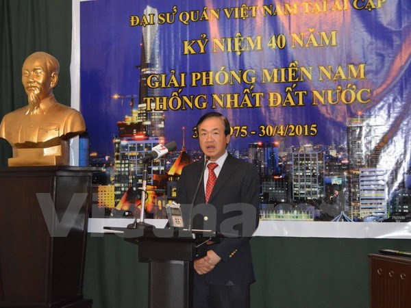 Cùng ngày, Đại sứ quán Việt Nam tại Ai Cập cũng long trọng tổ chức lễ kỷ niệm 40 năm thống nhất đất nước. Tới dự có đông đảo cán bộ, nhân viên Đại sứ quán, gia đình Việt kiều và các du học sinh Việt Nam. Đại sứ Việt Nam tại Ai Cập Đào Thành Chung nhấn mạnh thắng lợi vĩ đại mùa Xuân năm 1975 thể hiện sự lãnh đạo đúng đắn của Đảng CSVN, vai trò của Chủ tịch Hồ Chí Minh, thể hiện bản lĩnh và trí tuệ Việt Nam, là kết quả của cả một quá trình đấu tranh anh dũng của nhân dân VN. Chiến thắng cũng có ý nghĩa trong việc xây dựng khối đoàn kết liên minh chiến đấu chống kẻ thù chung của ba dân tộc Việt Nam, Lào, Campuchia cùng sự ủng hộ to lớn cả về vật chất và tinh thần của cộng đồng quốc tế.