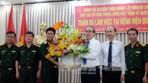 | Chủ tịch UBTƯ MTTQ Việt Nam Nguyễn Thiện Nhân đến thăm, chúc mừng tập thể cán bộ, bác sĩ, nhân viên y tế Bệnh viện Quân y 175 (Bộ Quốc phòng). Ảnh: TTXVN |