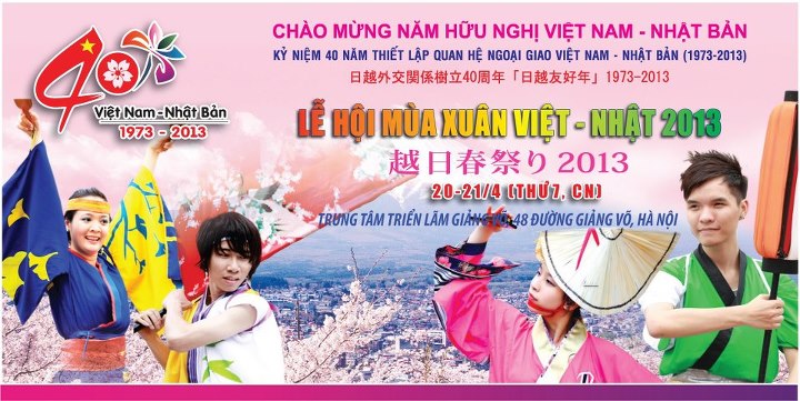 (VOV5) - Lễ hội mùa Xuân Việt - Nhật 2013 sẽ được tổ chức trong 2 ngày 20 và 21/4 tại Trung tâm Hội chợ Triển lãm Việt Nam (148 Giảng Võ, Hà Nội) với nhiều hoạt động văn hóa đặc sắc, hấp dẫn. Đây là hoạt động kỷ niệm 40 năm thiết lập quan hệ ngoại giao giữa Việt Nam và Nhật Bản do Cục hợp tác Quốc tế (Bộ Văn hóa, Thể thao và Du lịch) và Hội Giao lưu Văn hóa Việt - Nhật phối hợp tổ chức.