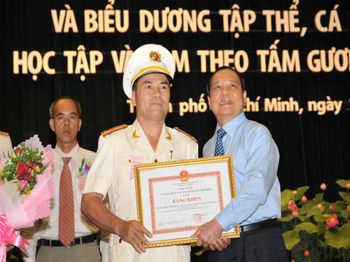 | Bí thư Thành ủy TP.HCM Lê Thanh Hải (phải) trao bằng khen cho các cá nhân điển hình - Ảnh: Diệp Đức Minh |