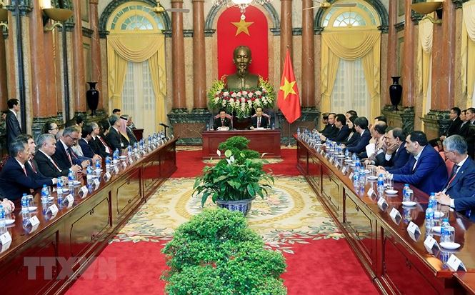 Chiều 19/9/2018, tại Phủ Chủ tịch, Chủ tịch nước Trần Đại Quang tiếp Trưởng đoàn các Cơ quan Kiểm toán tối cao châu Á nhân dịp tham dự Đại hội Tổ chức các Cơ quan Kiểm toán tối cao châu Á (ASOSAI) lần thứ 14. (Ảnh: TTXVN)