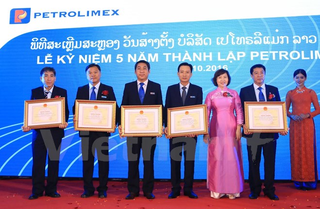 | hứ trưởng Hồ Thị Kim Thoa trao bằng khen, giấy khen cho tập thể và các cá nhân của Petrolimex Lào. (Ảnh: Phạm Kiên/Vietnam+) |