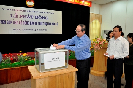 (VOV5) - Chiều 2/10, Ủy ban Trung ương MTTQ Việt Nam tổ chức quyên góp, ủng hộ đồng bào miền Trung vừa gánh chịu thiệt hại do bão Wutip gây ra. Chủ tịch Ủy ban Trung ương MTTQ Việt Nam, Phó Thủ tướng Nguyễn Thiện Nhân kêu gọi người dân cả nước hãy dành cho đồng bào vùng bị thiệt hại do bão lũ sự giúp đỡ thiết thực về vật chất, tinh thần, góp phần nhanh chóng khôi phục sản xuất và ổn định đời sống của nhân dân.