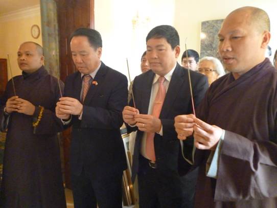 Tại buổi gặp mặt, Ông Bùi Thanh Hà và Đại Đức Thích Trí Đắc đã gửi lời chúc mừng năm mới đến ông Đỗ Xuân Đông và cộng đồng người Việt Nam tại CH Séc. Ngài đại sứ Đỗ Xuân Đông cũng bày tỏ vui mừng trước sự quan tâm của Ban tôn giáo chính phủ tới đời sống tâm linh của bà con Việt xa quê. Ông đánh giá cao vai trò của Hội Phật tử Việt Nam tại CH Séc, một tổ chức cộng đồng rất lớn mạnh, với mục tiêu hoạt động rõ ràng đã đoàn kết người Việt Nam, đáp ứng được sự mong mỏi khát khao tâm linh của bà con nơi xa xứ. Đồng thời cũng chia sẽ niềm vui và mong mỏi lớn nhất của cộng đồng người Việt trong năm 2013 sẽ trở thành 1 bộ phận dân tộc của nước Séc để có được nhiều quyền lợi về mặt an sinh xã hội và bảo tồn văn hóa người Việt tại nước ngoài, sẽ có được một trung tâm văn hóa dành cho người Việt, nếu được thành công thì Séc sẽ là nơi đầu tiên trên thế giới người Việt Nam tại hải ngoại được công nhận là một dân tộc thiểu số tại nước sở tại, và với mong ước được sự gia hộ của tam bảo, của hồn thiêng sông núi nước Việt nguyện ước này sẽ được viên thành. Sau đó đoàn cùng dâng hương tại ban thờ Chủ tịch Hồ Chí Minh.