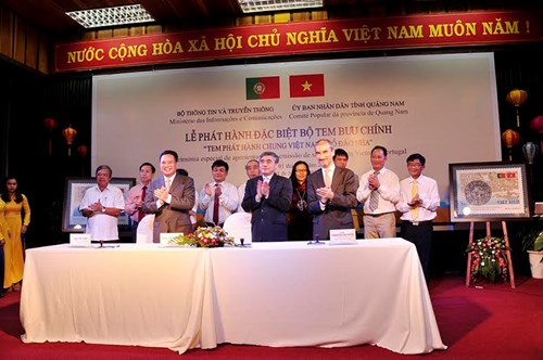 Sáng 1/7, tại thành phố Hội An, Bộ Thông tin và Truyền thông, Bộ Ngoại giao, Tổng Công ty Bưu điện Việt Nam phối hợp với Ủy ban nhân dân tỉnh Quảng Nam tổ chức Lễ phát hành bộ tem bưu chính “Tem phát hành chung Việt Nam - Bồ Đào Nha”. Bộ tem gồm 2 mẫu do họa sỹ Tô Minh Trang (Tổng Công ty Bưu điện Việt Nam) và các họa sỹ của Bồ Đào Nha cùng thiết kế. Tem được thiết kế với khổ 43 x 32mm. Điểm chung của bộ tem chung đó là được thể hiện theo ngôn ngữ đồ họa, kết hợp nhiều không gian khác nhau tạo hiệu ứng kết nối từ quá khứ đến hiện tại. Tất cả được bố cục cân đối trên nền màu tím và vàng nhạt, hàm chứa nhiều ý nghĩa về hai thành phố cổ Hội An và Lisbon nhưng cũng mang đậm bản sắc văn hóa dân tộc của hai nước Việt Nam và Bồ Đào Nha.