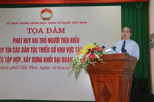 Tham dự buổi tọa đàm còn có đại diện các bộ, ban ngành Trung ương, Ban Chỉ đạo Tây Nam Bộ, thành phố Cần Thơ cùng 40 đại biểu tiêu biểu có uy tín trong 13 tỉnh khu vực Tây Nam bộ, đại diện cho gần 4.000 người tiêu biểu có uy tín về tham dự. Phát biểu tại toạ đàm, Chủ tịch UBMTTQ Việt Nam Nguyễn Thiện Nhân đánh giá cao các địa phương đã đưa ra những chủ trương, chính sách phù hợp, gắn liền với chỉ đạo Chính phủ, từ đó giúp cho đồng bào dân tộc có nhiều đóng góp quan trọng cho địa phương mình. Về phương thức để phát huy vai trò của các cá nhân có uy tín tiêu biểu để họ đóng góp vào sự phát triển của địa phương, Chủ tịch Nguyễn Thiện Nhân cho rằng những người tiêu biểu có uy tín, người dân tộc có lợi thế là những người được nhân dân quý trọng vì gia đình và bản thân gương mẫu, là những người nói và nghe bằng tiếng đồng bào dân tộc. Chính vì vậy, những người đại biểu tiêu biểu có thể nói với đồng bào bằng ngôn ngữ của họ, là những người hiểu được lịch sử của dân tộc và địa phương mình có thể nói cho bà con về tương lai bằng những kinh nghiệm trong lịch sử của các dân tộc, họ là những người có ý thức xây dựng cộng đồng, trách nhiệm trong công cuộc xây dựng địa phương, góp phần xây dựng đất nước.