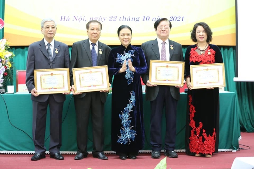 Chủ tịch VUFO Nguyễn Phương Nga trao tặng kỷ niệm chương và bằng khen cho các cá nhân xuất sắc của Hội hữu nghị Việt Nam-Triều Tiên. (Nguồn: VUFO) |