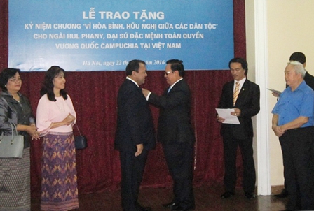 (VOV5) - Ngày 22/7, tại Hà Nội, Chủ tịch Liên hiệp các tổ chức hữu nghị Việt Nam Vũ Xuân Hồng trao Kỷ niệm chương “Vì hòa bình hữu nghị giữa các dân tộc” tặng Đại sứ Vương quốc Campuchia Hul Phany, nhân dịp kết thúc nhiệm kỳ công tác tại Việt Nam.
