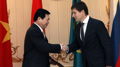 | Bộ trưởng Bộ Công Thương Vũ Huy Hoàng và Bộ trưởng phụ trách thương mại Uỷ ban Kinh tế Á-Âu Andrei Slepnev trao đổi biên bản đàm phán |