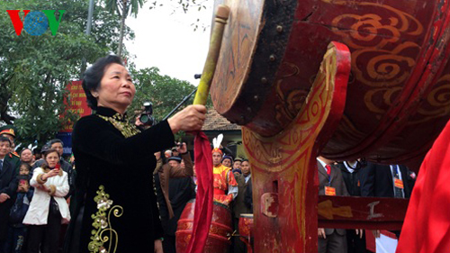 | Phó Chủ tịch nước Nguyễn Thị Doan đánh trống khai hội |