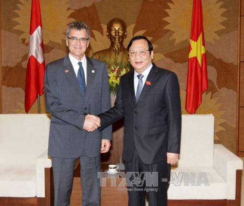 | Phó Chủ tịch Quốc hội Huỳnh Ngọc Sơn tiếp ngài Pierre Francois Veillon, Trưởng đoàn Đại biểu Quốc hội Thụy Sỹ. Ảnh: Phương Hoa/TTXVN |
