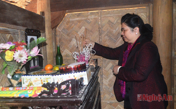 | Đồng Chí Tòng Thị Phóng thắp hương tại Di tích nhà cụ Vi Văn Khang tại xã Môn Sơn, huyện Con Cuông |