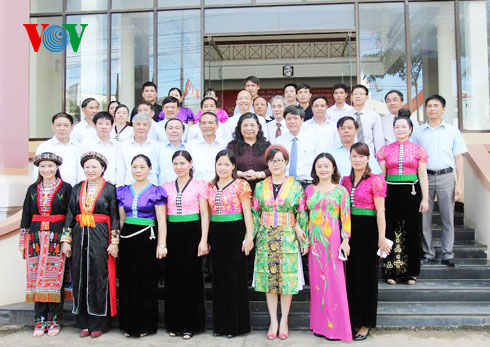 | Phó Chủ tịch Quốc hội Tòng Thị Phóng chụp ảnh lưu niệm với lãnh đạo Đài, cán bộ và phóng viên, biên tập viên CQTT Đài Tiếng nói Việt Nam khu vực Tây Bắc (Ảnh: Thanh Thủy) |