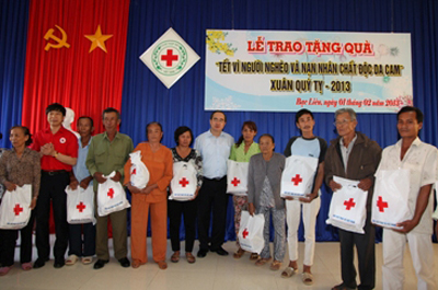 | Phó Thủ tướng Nguyễn Thiện Nhân tặng quà cho các gia đình nghèo và nạn nhân chất độc da cam. Ảnh: VGP |