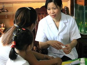 | Nhân viên y tế tư vấn, giám sát điều trị cho người có HIV. (Ảnh: TTXVN) |