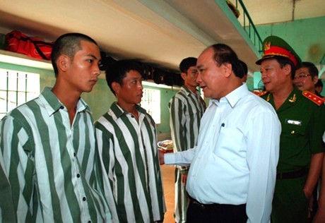 | Phó Thủ tướng Nguyễn Xuân Phúc thăm hỏi các phạm nhân trong chuyến công tác tới Trại giam Ninh Khánh, Ninh Bình (Ảnh: VGP) |