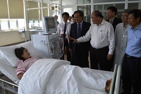 | Phó Thủ tướng Nguyễn Xuân Phúc thăm, động viên bệnh nhân điều trị tại Trung tâm điều trị theo yêu cầu và quốc tế, BV Trung ương Huế (Ảnh:Chinhphu.vn) |