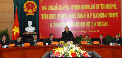 Phát biểu tại buổi làm việc, Phó thủ tướng Nguyễn Xuân Phúc đánh giá cao và biểu dương Đảng bộ, chính quyền Thành phố Hải Phòng đã đạt nhiều kết quả đáng mừng trong công tác đấu tranh, phòng chống tội phạm. Hải Phòng có nhiều mô hình tốt, cách làm hay, vào cuộc quyết liệt, đồng bộ, góp phần giữ vững sự bình yên của thành phố và củng cố niềm tin của nhân dân. Phó Thủ tướng lưu ý thành phố Hải Phòng cần nhanh chóng khắc phục những tồn tại, hạn chế, tập trung triệt phá tội phạm ma túy, tội phạm có tổ chức cùng các loại tội phạm mới. Đồng thời, tăng cường công tác quản lý nhà nước về an ninh trật tự, đẩy mạnh cải cách hành chính, làm tốt công tác phối hợp giữa các lực lượng, cơ quan, địa phương, thường xuyên kiểm tra, đôn đốc và triển khai hiệu quả đợt cao điểm tấn công, trấn áp tội phạm trong dịp Tết nguyên đán./.