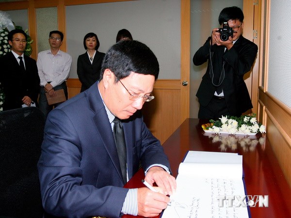 | Phó Thủ tướng, Bộ trưởng Bộ Ngoại giao Phạm Bình Minh đến Đại sứ quán Hàn Quốc tại Việt Nam viếng, ghi sổ tang và chia buồn đối với gia đình các nạn nhân bị thiệt mạng trong vụ chìm phà SEWOL. (Ảnh: Thống Nhất/TTXVN) |