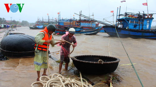| Ngư dân chằng neo tàu thuyền tại cảng Cửa Việt trước khi bão vào |