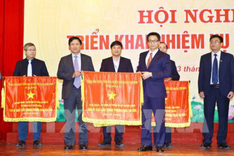 | Phó Thủ tướng Vũ Đức Đam trao tặng Cờ thi đua của Chính phủ cho 6 tập thể có thành tích xuất sắc trong phong trào thi đua năm 2016. Ảnh: Minh Quyết – TTXVN |