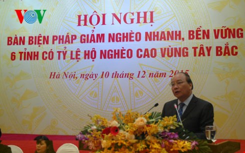 Sáng nay, tại Hà Nội, Ban Chỉ đạo Tây Bắc phối hợp với Bộ Lao động Thương binh và Xã hội và Ngân hàng Nhà nước Việt Nam tổ chức hội nghị bàn biện pháp giảm nghèo nhanh, bền vững tại 6 tỉnh có tỷ lệ hộ nghèo cao ở vùng Tây Bắc, gồm Hà Giang, Cao Bằng, Yên Bái, Sơn La, Điện Biên và Lai Châu. Phát biểu chỉ đạo hội nghị, Phó Thủ tướng Nguyễn Xuân Phúc, Trưởng ban Chỉ đạo Tây Bắc, nhấn mạnh những năm qua, công cuộc giảm nghèo của Việt Nam có bước tiến vượt bậc. Việt Nam về đích trước thời hạn nhiều Mục tiêu thiên niên kỷ, trong đó có mục tiêu giảm nghèo. Khu vực Tây Bắc luôn được quan tâm ưu tiên về cơ chế chính sách, nguồn lực để thực hiện mục tiêu giảm nghèo nhanh, tuy nhiên tỷ lệ hộ nghèo toàn vùng Tây Bắc vẫn ở mức cao. Phó Thủ tướng Nguyễn Xuân Phúc nêu rõ: "Theo chuẩn nghèo mới, mục tiêu, nhiệm vụ giảm nghèo bền vững của chúng ta không thay đổi nhưng giải pháp thực hiện phải đồng bộ, toàn diện, hiệu quả để người nghèo vừa được nâng cao thu nhập, vừa được tiếp cận đầy đủ dịch vụ xã hội cơ bản và quan trọng là phải đẩy lùi, tiến tới xóa bỏ tận gốc rễ căn nguyên đói nghèo, đảm bảo mục tiêu thoát nghèo bền vững. Cần tìm ra nguyên nhân của đói nghèo là vô cùng quan trọng, từ nguyên nhân đó chúng ta có giải pháp thích hợp cho từng vùng, địa phương."