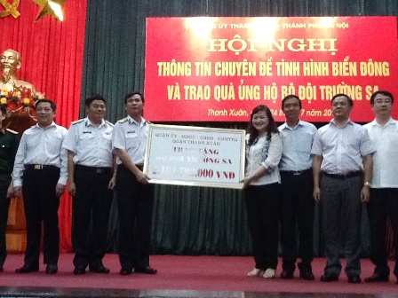 (VOV5) - Hơn 2,1 tỷ đồng là số tiền của Quận ủy Thanh Xuân, Hà Nội ủng hộ bộ đội Trường Sa. Số tiền này được Quận ủy Thanh Xuân trao tặng Quân chủng Hải quân tại hội nghị thông tin chuyên đề tình hình biển Đông, đánh giá công tác tuyên truyền, giáo dục biển, đảo Việt Nam 6 tháng đầu năm 2013 tổ chức sáng 24/7 tại Hà Nội.