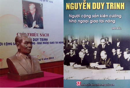 | Tượng đồng chân dung Cố Bộ trưởng Nguyễn Duy Trinh và bìa cuốn sách “Nguyễn Duy Trinh, người Cộng sản kiên cường-nhà ngoại giao tài năng”. |