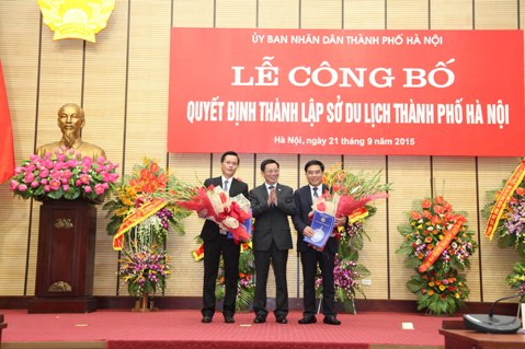 | Chủ tịch UBND TP. Hà Nội Nguyễn Thế Thảo trao quyết định thành lập và tặng hoa chúc mừng Giám đốc Sở Du lịch Hà Nội Đỗ Đình Hồng (bên phải) và Phó Giám đốc Trần Đức Hải (bên trái). Ảnh: TTXVN |