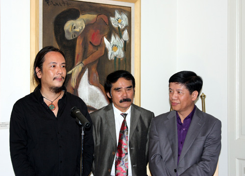 | Từ trái sang phải: hoạ sĩ Trần Lưu Mỹ, Phạm Lục, Đại sứ Nguyễn Quốc Cường |