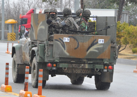 Binh sĩ Hàn Quốc tại một chốt kiểm tra quân sự ở thành phố biên giới Paju ngày 9/4. Ảnh: AFP