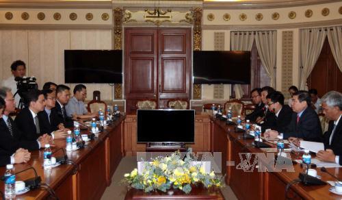 | Chủ tịch UBND TP.Hồ Chí Minh Nguyễn Thành Phong tiếp ông Kelvin Teo, Tổng Giám đốc điều hành công ty SEMBCORP Development, Singapore. Ảnh: Thanh Vũ - TTXVN |