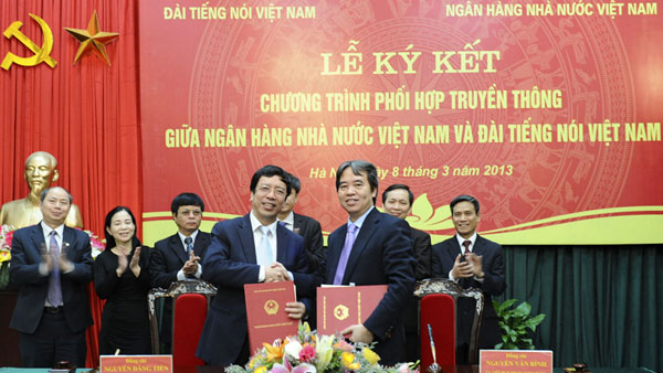 | Thống đốc NHNN Nguyễn Văn Bình (bên phải) và Tổng Giám đốc Đài TNVN Nguyễn Đăng Tiến ký thỏa thuận hợp tác |