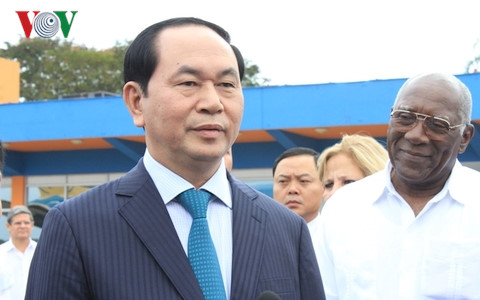 Ngay khi xuống sân bay Jose Marti, Chủ tịch nước Trần Đại Quang đã trả lời phỏng vấn báo chí Cuba và các phóng viên Việt Nam tháp tùng đoàn. Chủ tịch nước Trần Đại Quang nhấn mạnh chuyến thăm lần này là dịp để Chủ tịch nước và Đoàn được tận mắt chứng kiến và chúc mừng lãnh đạo, nhân dân Cuba anh em về những thành tựu kinh tế-xã hội to lớn và những thắng lợi ngoại giao quan trọng của Đảng, Nhà nước và nhân dân Cuba trong thời gian qua, tạo thế và lực mới cho giai đoạn phát triển tiếp theo của đất nước, không ngừng nâng cao vị thế và uy tín của Cuba ở khu vực và trên trường quốc tế. Chủ tịch nước Trần Đại Quang cho biết lãnh đạo hai nước Việt Nam và Cuba nhân dịp này cũng sẽ tập trung trao đổi về các biện pháp nhằm tiếp tục làm sâu sắc hơn nữa mối quan hệ đặc biệt Việt Nam - Cuba trên tất cả các lĩnh vực, coi trọng tăng cường quan hệ chính trị tin cậy, đẩy mạnh và từng bước đưa quan hệ hợp tác kinh tế, thương mại và đầu tư song phương lên ngang tầm quan hệ tốt đẹp giữa hai nước. Việt Nam và Cuba cũng tiếp tục sát cánh, ủng hộ lẫn nhau tại các tồ chức quốc tế và diễn đàn đa phương nhằm bảo vệ quyền và lợi ích hợp pháp, chính đáng của mỗi nước; đóng góp tích cực cho hòa bình, ổn định, hợp tác và phát triển ở hai khu vực và trên thế giới.