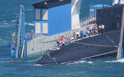 | Tách tàu ngầm Hải Phòng ra khỏi tàu vận tải - Ảnh: Tiến Thành/Tuổi trẻ |