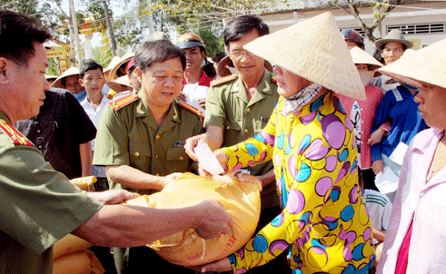 | Đại diện Báo Công an thành phố và Công an tỉnh Cà Mau tặng quà cho đồng bào nghèo xã Quách Văn Phẩm, huyện Đầm Dơi. Ảnh: báo công an thành phố Hồ Chí Minh. |
