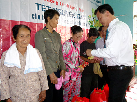 | Đại diện Ngân hàng TMCP Kiên Long Chi nhánh Hậu Giang trao quà tết cho bà con nghèo. Ảnh: baohaugiang |