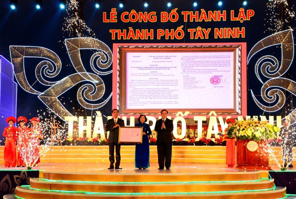 (VOV5) - Tối 14/2, Tỉnh ủy, HĐND, UBND, Ủy ban Mặt trận Tổ quốc Việt Nam tỉnh Tây Ninh tổ chức Lễ công bố Nghị quyết của Chính phủ về việc thành lập Thành phố Tây Ninh thuộc tỉnh Tây Ninh.
