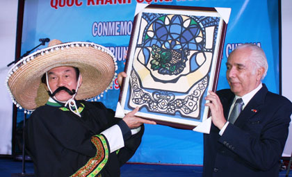 | Tổng lãnh sự Cuba tại TP. Hồ Chí Minh - Gabriel Perez Tarrau tặng bức tranh thêu hữu nghị cho ĐH quốc tế Hồng Bàng (Ảnh: hanoimoi.com) |